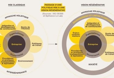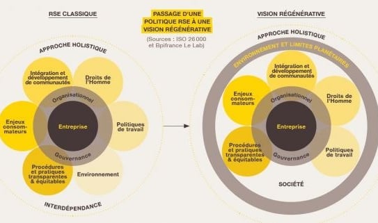 La régénération stimule la refonte et l’innovation du modèle économique de la circularité alors que la démarche RSE (documentée par la norme ISO 26000 de 2010) cherche principalement à réduire des impacts négatifs de l’activité d’une entreprise sur l’environnement et la société.